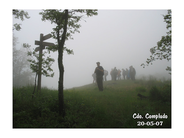 Nos metimos entonces por el verde entre matorral bajo hasta alcanzar poco después una cresta rocosa. Por ella fuimos subiendo y bajando desniveles apenas considerables hasta que la dejamos atrás y ya subimos visiblemente por la loma del pico Rebueno dando vista hacia el valle que sube hacia San Isidro cuyas cumbres se encontraban totalmente cerradas por las nieblas. En la cima montana de este pico no vimos señal alguna de cumbre y como más adelante estaba otra que nos parecía igual de alta o más, bajamos al collado intermedio para comenzar luego a subir la misma. A las 14:50 horas, y tras 11,500 Km. llegamos al supuesto pico Mahón. Desde el principio Luis dijo que aquel no era ya que no hacía tanto que había subido, por otro lado, y había un buzón. A mí me parecía que sí ya que estaba en la creencia de que era el más alto de la zona, aunque estaba equivocado. Además, vimos como el más alto era la cumbre anterior por la que habíamos pasado, la del Rebueno según el mapa. Estábamos ahora en el Cubero, con más o menos 1900 metros. Desde allí vimos en el valle contrario el pueblo de Valverde de la Cuerna.