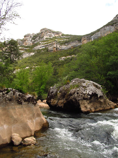 allí bajamos. Enormes rocas obstaculizan el caudal del Ebro entre las cuales