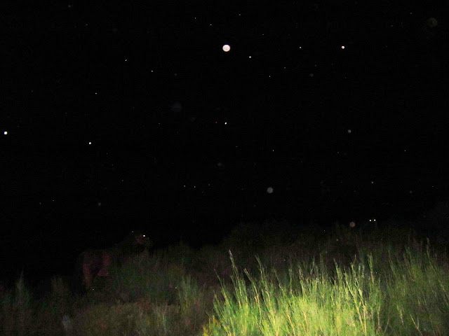 Habíamos decidido hacer el resto del trayecto por el ancho camino, al lado del cual seguíamos encontrando algunas vacas, terneros y caballos entre los matorrales y escobas. Subimos un pequeño tramo desviándonos un poco hacia una vaguada lateral antes llegar a otra pasarela similar a la anterior sobre el arroyo Aguazones de Tonín. La cruzamos para descender y colocarnos de nuevo paralelos al principal. Con la luz de los frontales íbamos viendo unos reflejos en el suelo, y como ya sospechábamos de algunas rutas nocturnas, eran los ojos de pequeñas arañas que se escabullían al acercarnos. Con el flash de la cámara pude sacar alguna foto a los servales del cazador y sus frutos rojos destacando.