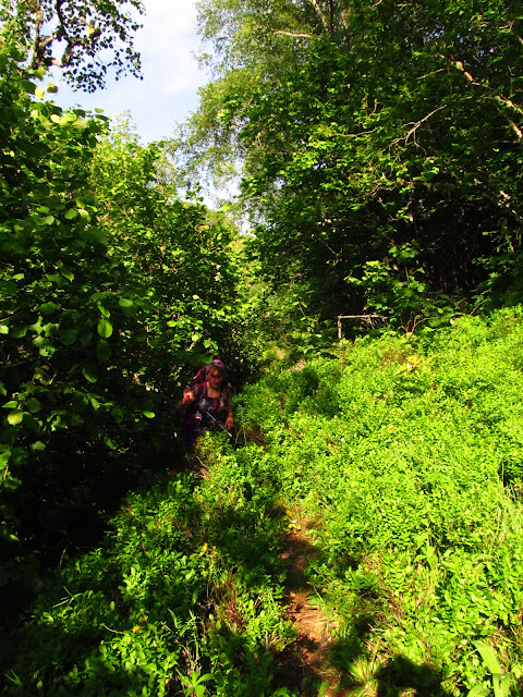 A las 17:10 horas iniciamos nosotros cinco el descenso hacia el primer collado por el mismo sendero de subida. En él, una señal marcaba la dirección a la braña de Cubacho hacia el valle Norte al que nos echamos. Siguiendo una senda por la vaguada y entre verdes praderías y matorral bajo perdimos altura. El contraste de colores era espectacular con esas escobas floridas, arbustos y la misma campa verde. Llegamos a una lagunilla que rodeamos entre terreno algo anegado y dejamos atrás un chozo derruido de piedras. Algunos canchales de roca moteaban esta bonita bajada en la que cruzamos más abajo el arroyo Cubachín. Pasamos entre los restos también derruidos de la Majada de La Culebra y entramos a la sombra del bosque de especies variadas. No soy de los que reconoce fácilmente los diferentes árboles y solo puedo afirmar que había algunos avellanos. Fuimos bajando entre todo ello y cruzamos otra pradería antes de enlazar con un ancho camino a la vera de un cercado.