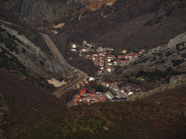 Desde ese punto ascendimos por ese camino a lo largo de unos 700 metros sorteando el hielo que cubría buena parte del firme en una zona en la que el sol no da en todo el día. Por la derecha, al Norte, veíamos el desfiladero por el que baja otro camino hacia Santa Lucia de Gordón, pueblo ya cercano al que no íbamos a llegar. Cuando se programó la ruta modifiqué el track manualmente para evitar llegar a este pueblo atajando por detrás de la Peña el Castro de 1242 metros encima de la cual se veían unas antenas. Pues bien, este tramo trazado “a mano” se desviaba del camino y así lo hicimos sin darme cuenta en ese momento de tal detalle. Enseguida rectificamos y volvimos al camino, que ahora bajaba bruscamente hacia otra vaguada cercana que terminaba en la carretera. En ella vimos por delante Vega de Gordón y algunos edificios de Santa Lucia.